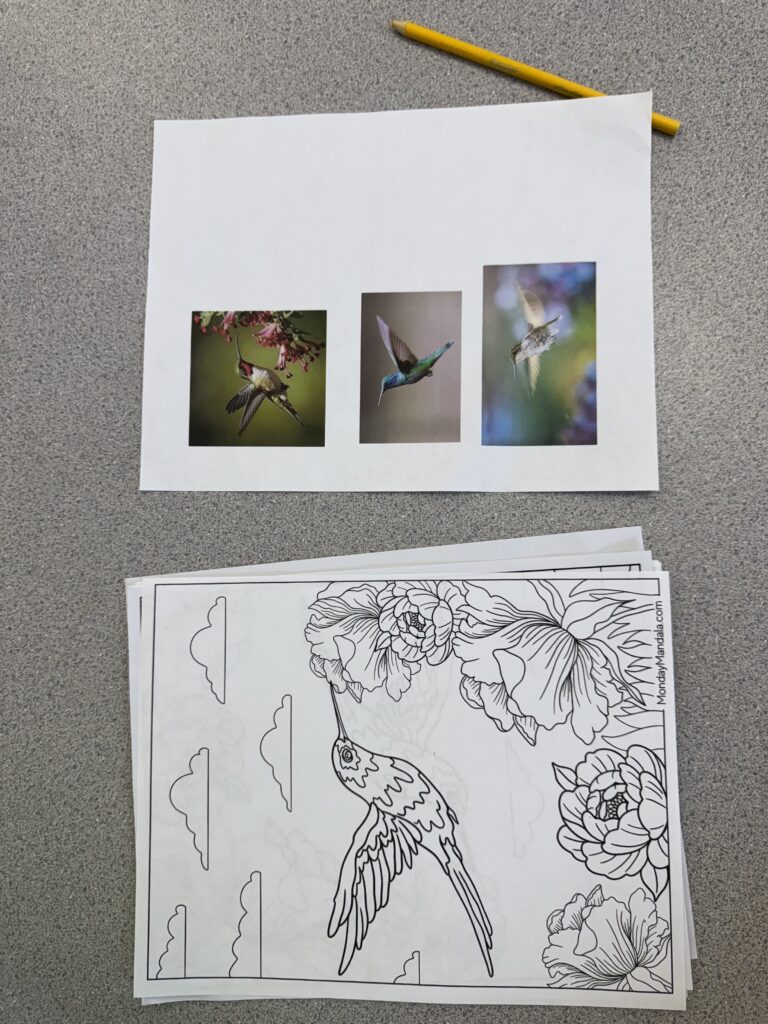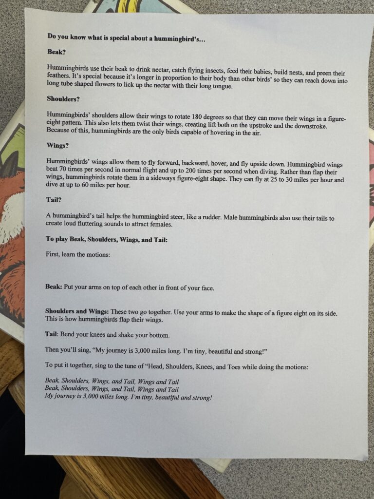 With this time of year the fall migration of the humming bird happens. We learned about humming birds this week in our Story Hour. Also we colored humming bird pictures. There is also a fun song to sing!
